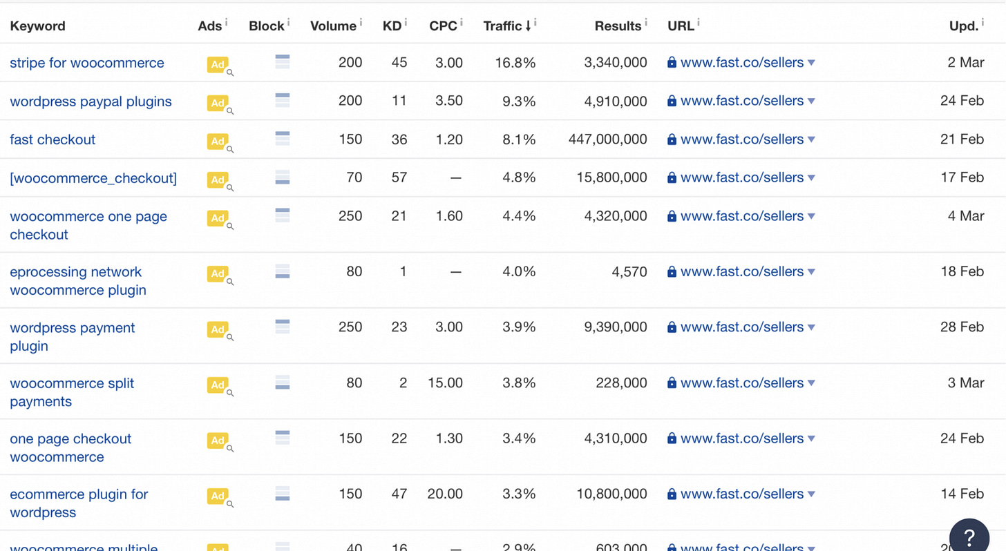 For example, they’re running ads on the phrase “stripe for woocommerce” and related terms, but they’re linking to their generic /sellers page when they should be linking to their dedicated woo page. Further, they don’t actually offer “stripe for woocomerce” as far as I can tell.