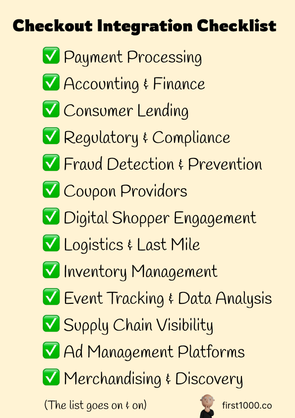 Integration in the checkout space is complicated. Each category is fragmented across 5-10 big players, sometimes even more. By numbers alone, a checkout provider would need anywhere from 100 to 500 different partner integrations to be “viable.”