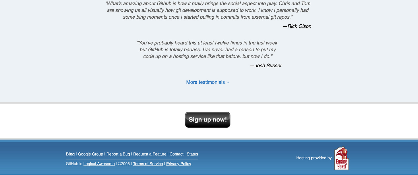 The problem with taking this sit-and-wait-for-Git-to-be-popular approach meant that the duo couldn't raise significant dollars for the project, and hosting software costs a bag loads of monies. So they leaned into their Ruby on Rails community and got connected to web hosting company Engine Yard. They struck a deal for free hosting in exchange for a footer banner promoting the company.