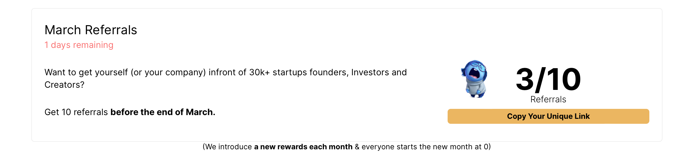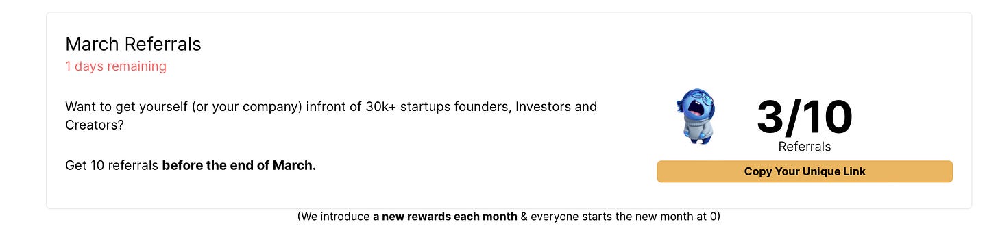 Every month, I introduce one reward with just one milestone (hit X to get Y). For instance, in March, people who got 10 or more referrals get a shoutout in the newsletter.
