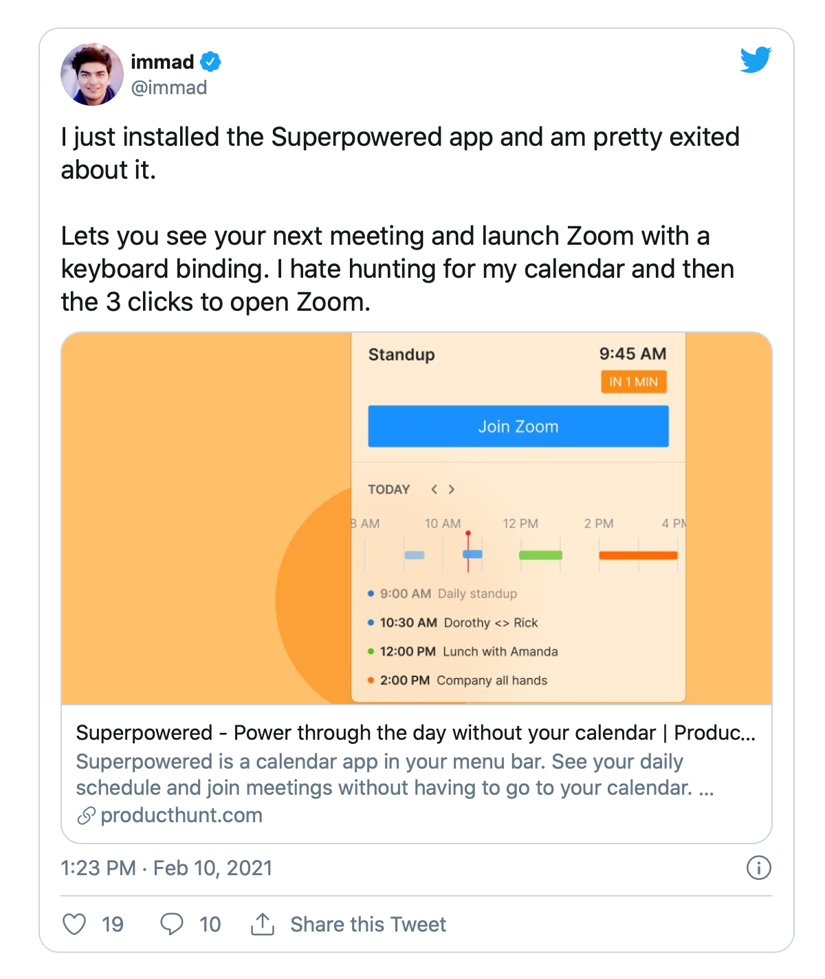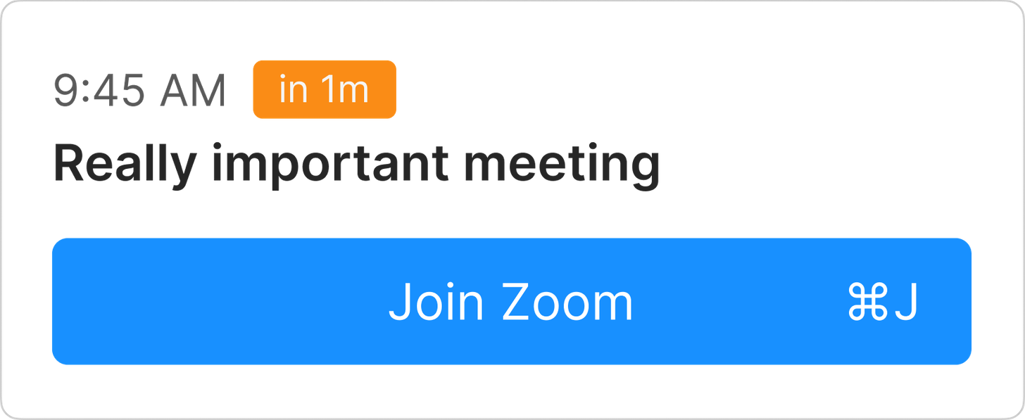 SuperpoweredĀ is an awesome product! It is a new twist on Calendars. With one shortcut (CMD+J) you can automatically join the next meeting on your calendarā¦and it gives you an elegant view of your calendar straight from your menu bar!Ā
