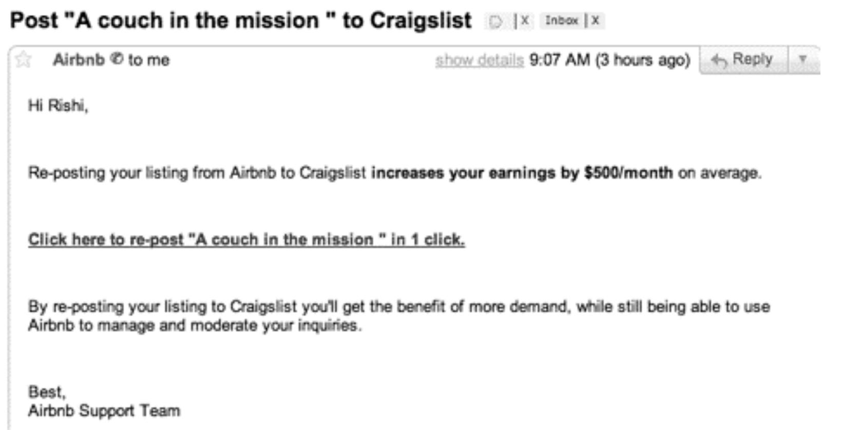 In order to tap into this market, Airbnb offered users who listed properties on Airbnb the opportunity to post them to Craigslist as well, despite the fact that there was no sanctioned way on Craigslist to do so. Though fairly straightforward in hindsight, the execution was not simple.