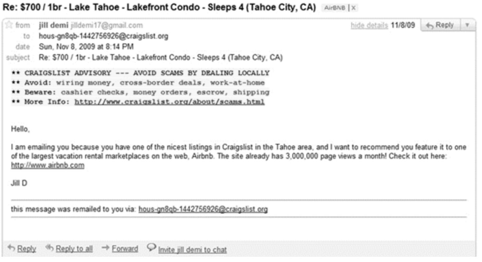 Furthermore, there was the issue of the anonymous email assigned by Craigslist. This function had to be turned off and replaced with a link to the Airbnb listing. And to ensure that the listing stood out among the standard Craigslist fare, the platformâs limited HTML support had to be taken into consideration as well. As writer and entrepreneur Andrew Chen explained: