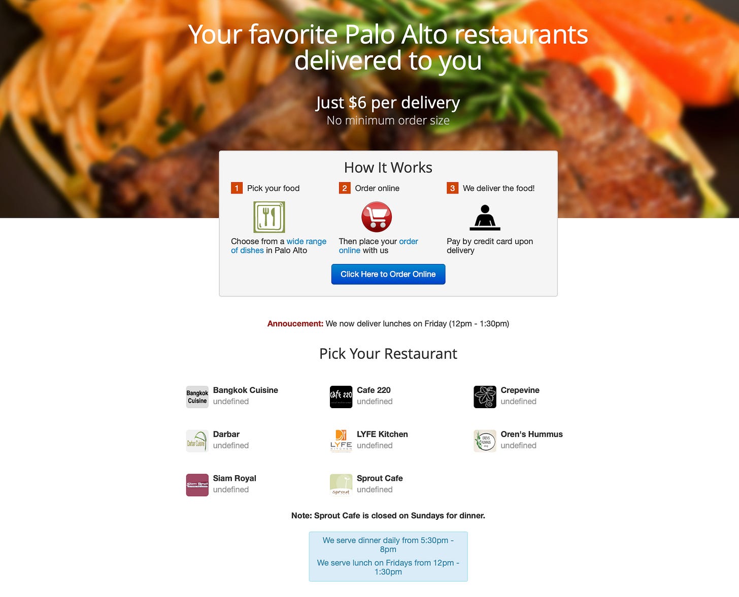When they launched their landing page, they wanted to validate that indeed people have the problem they are trying to solve and are willing to pay for it, and hence they didn't spend any time or money on "Marketing" or "Growth Hacking." Instead, they wanted to reach people in Palo Alto, searching for food delivery. They named their website PaloAltoDelivery.com in hopes that this would prompt the google engine to display their webpage favorably when people search for "Palo Alto Delivery." It worked. Half an hour of launching their page, they got their first phone call for a Thai Food order.