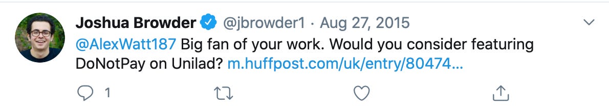 Getting your very first customer is a milestone to celebrate, and if you are building a product for yourself, then congrats, you made it past the first stop in this long, lonely and dreadful journey of being a founder. DoNotPay, as many other great companies, started by a founder frustration. Joshua Browder, 18 at the time, had just gotten his driving license and racked up a portfolio of 30 or so parking tickets within nine months. He didn't have the money to pay for these $100-$200 tickets and so he had to find creative ways to get out of them. After 10 hours of researching how to get tickets dismissed, Joshua figured out that it was easier than anticipated. All he had to do was draft legal letters to the concerned authorities. These letters often had grounds because the government did not follow its own rules when issuing tickets (they didn't have a sign to indicate how to park, the parking spot was too small for a car to fit in..etc). He managed to get 50% of his tickets dismissed, and boy was he onto something.