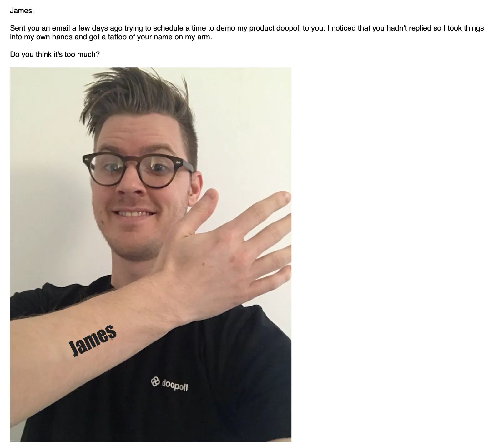 Being Funny: one variation of the campaigns they tried ended an email sequence with a last-ditch attempt where the subject line was: 'I want to work with you so bad I got a {firstName} tattoo on my arm.'