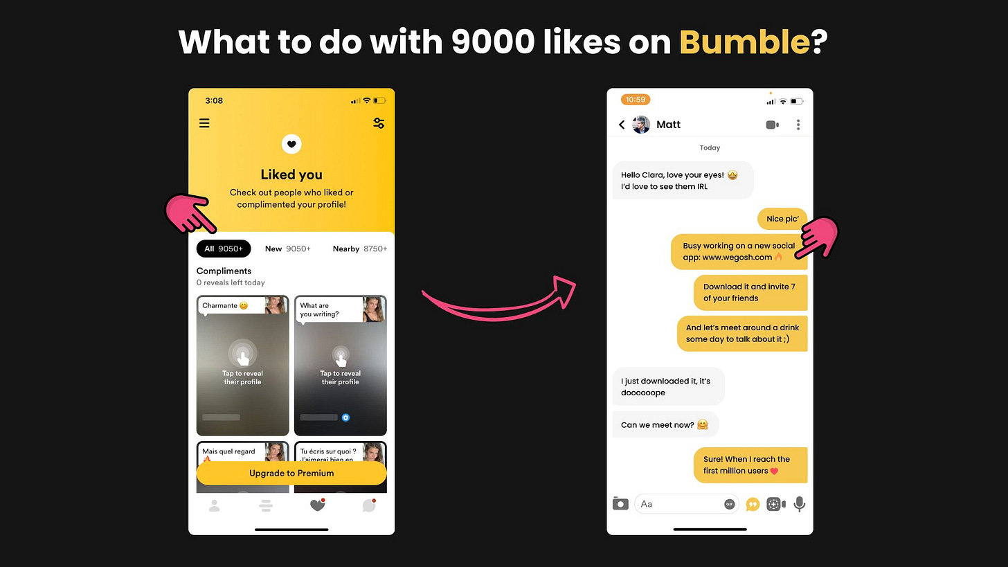Clara Gold, from Wegosh, replied to 9000+ likes on Bumble with the link to download her app.
