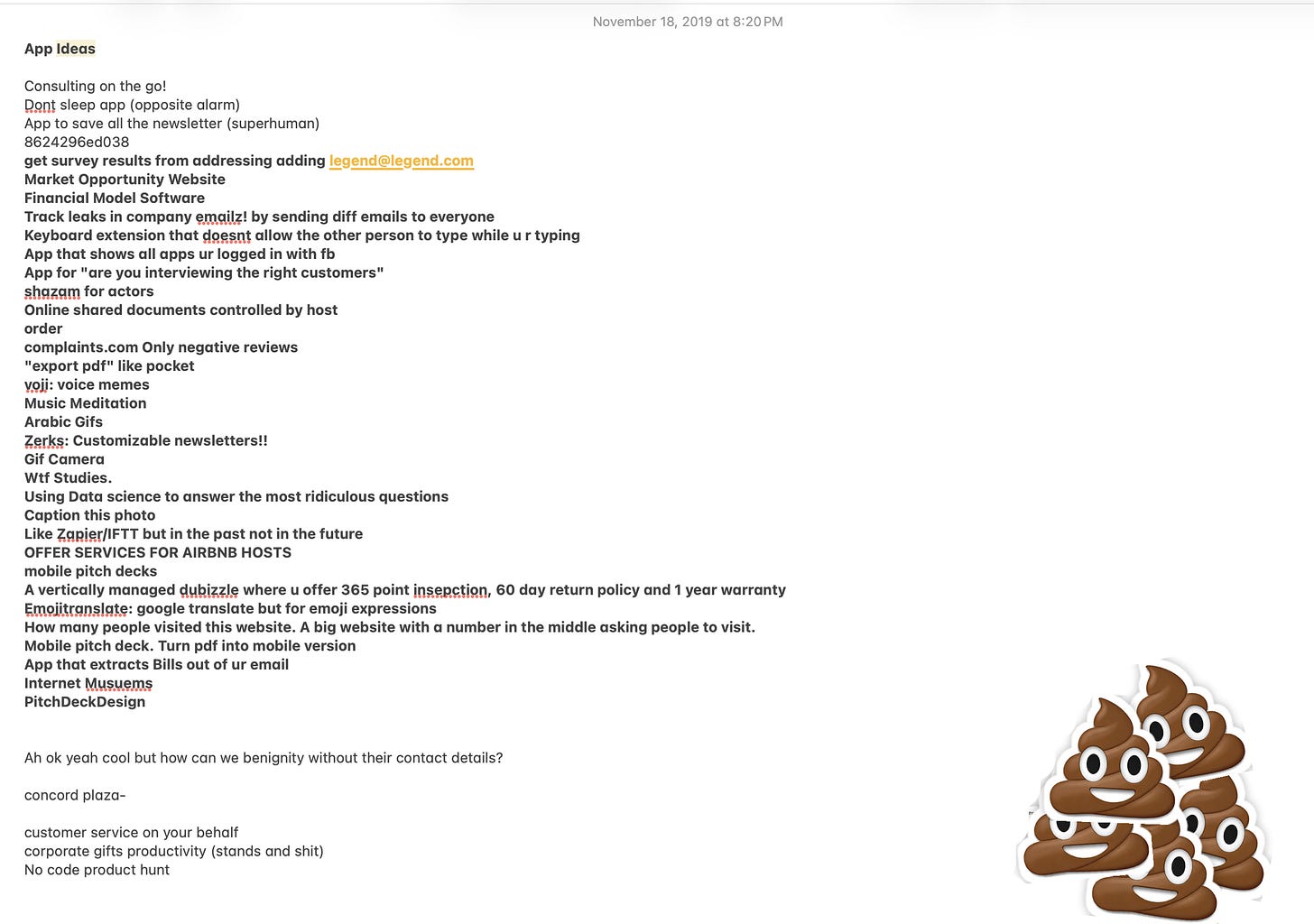 This cycle repeated so often that I started having different versions of the same ideas at different times, and I couldn’t even remember what the first idea was. That was the first push for me to start writing every thought down, a habit I continue to this day, not just for product ideas, but also for musings, learnings, feelings, and the back-and-forth debates I often have with the voices inside my head. I’ve added a snapshot of my 2019 ideas journal below, the earliest I could find. As you can probably tell, none of these are exactly screaming “go all in.”