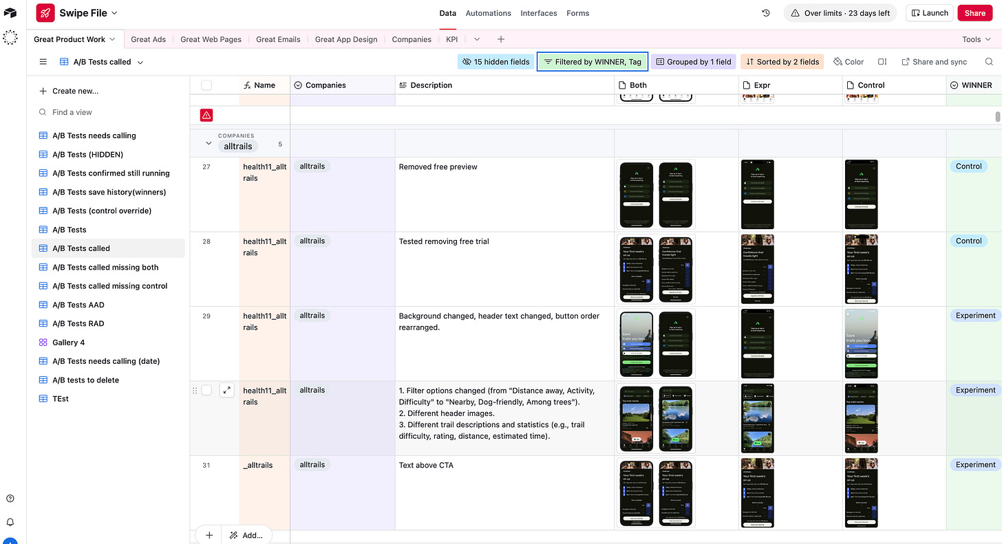 As a young product manager with something to prove, I went all in on competitive analysis. I started compiling the purchase flows and subscription hooks, the core flows my team owned at the time, across the top 10 apps in each App Store category (about 220 apps total). Every six months, I revisited these apps, tracked what had changed, and did team brainstorms to use those insights, along with our knowledge of Duolingo’s historical purchase flow A/B tests, to refine (and beef up) our roadmap.