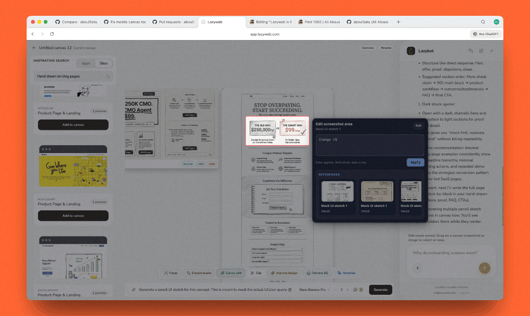Instead of starting from a blank page, you work from real examples and use AI to mock variations, compare ideas, and analyze patterns and iterate quickly without getting trapped in a single thread.