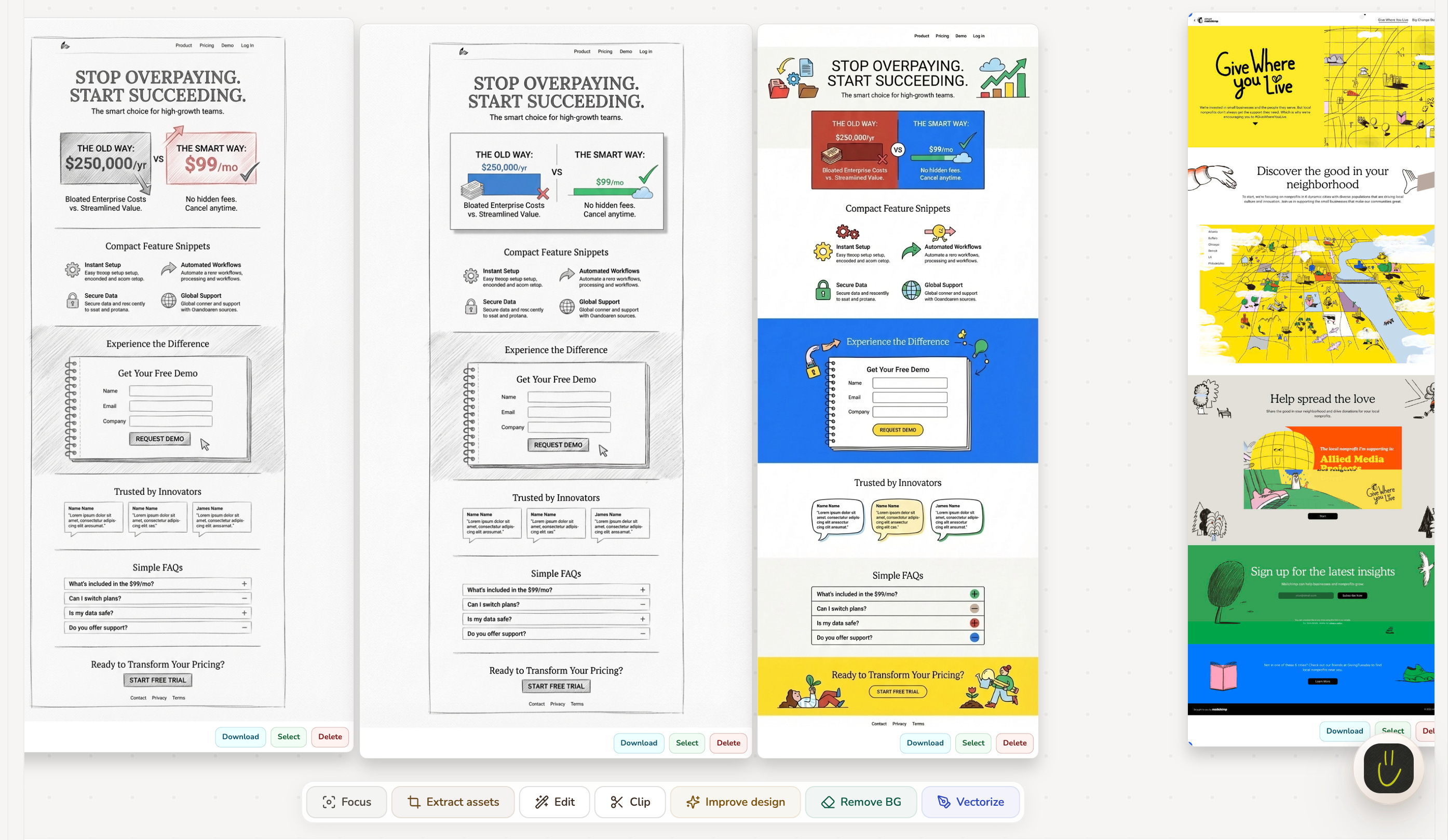 Once you land on something useful, you can keep going. You can edit with AI, extract assets, vectorize, upscale, and do the practical cleanup work that usually comes after exploration and when you are ready export these mocks and assets (and even references) to add to your favorite coding agent.