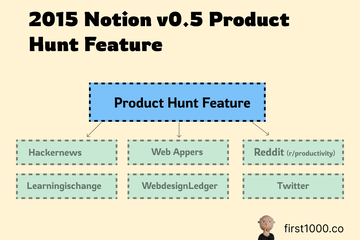 Take the 2015 v0.5 Product Hunt accidental launch. This was before the team moved to Kyoto and were still building Notion on the wrong tech Stack. An unintentional feature on Product Hunt ended up pouring down into half a dozen other online communities and getting Notion hundreds if not thousands of people knocking on their door to try out the product.