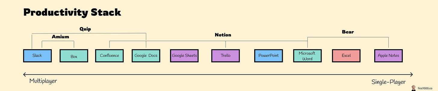 On the other hand, Quip, Amuim, Bear, et al. were forced to make a different set of choices. The core value proposition for these bundling solutions was layering in an additional productivity functionality on top of a familiar one. Hence, they had to go all-in Multiplayer utility (e.g., combining chat with file sharing is only useful when you have a meaningful number of team members using said software), making it harder to gain mindshare or go all-in on single-player utility, making it harder to monetize.