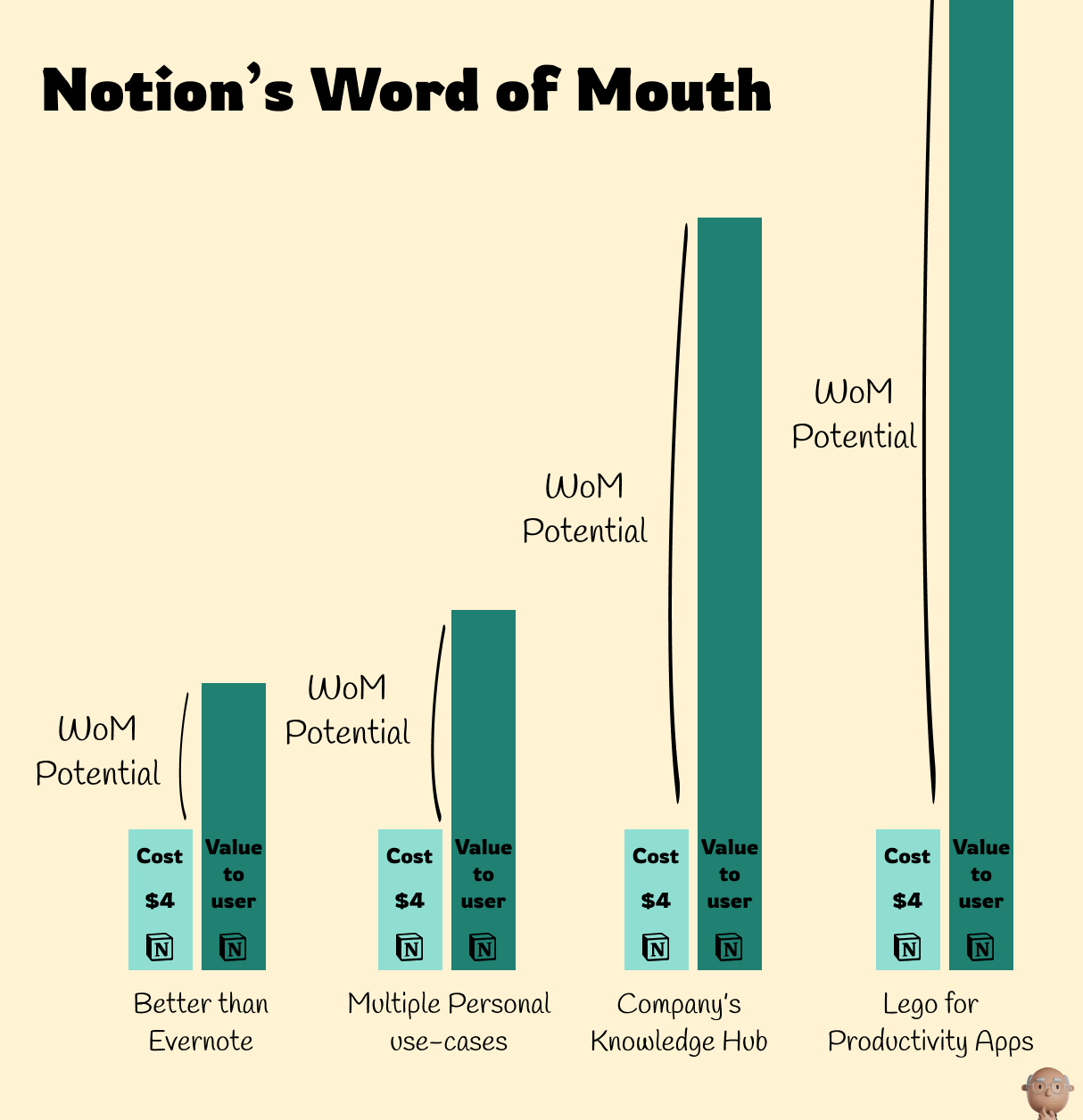 The more Notion widened the gap between cost & value, the more invested users became in the product and, in turn, recruited friends, colleagues, and collaborators onto the product.