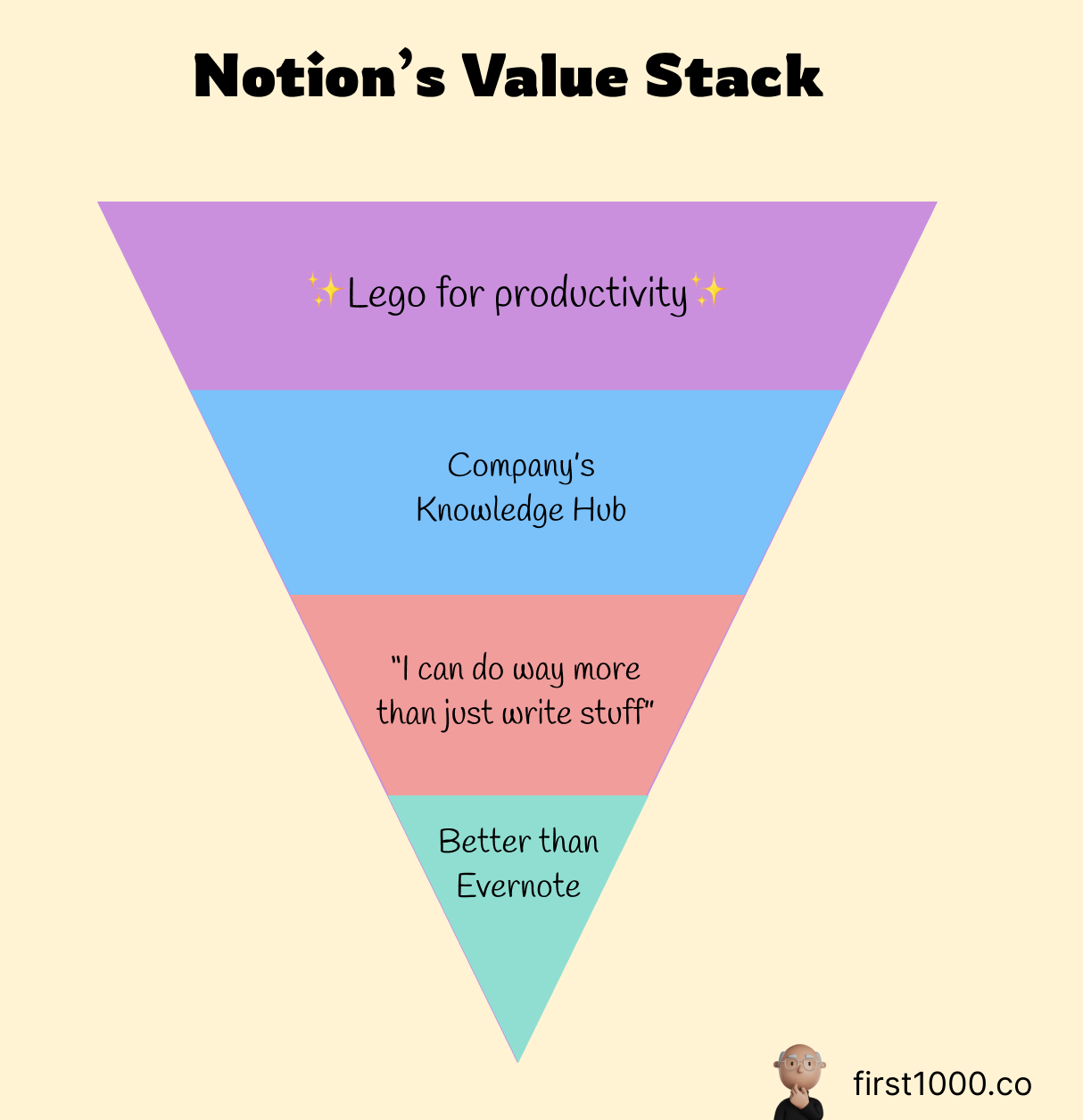 But Notion, like any new company getting started, didn't have a magical cohort of people who mastered their software and the block-first architecture. What they had, was a good product sense that maximized the number of people who reached the highest level of the Notion Value Stack.