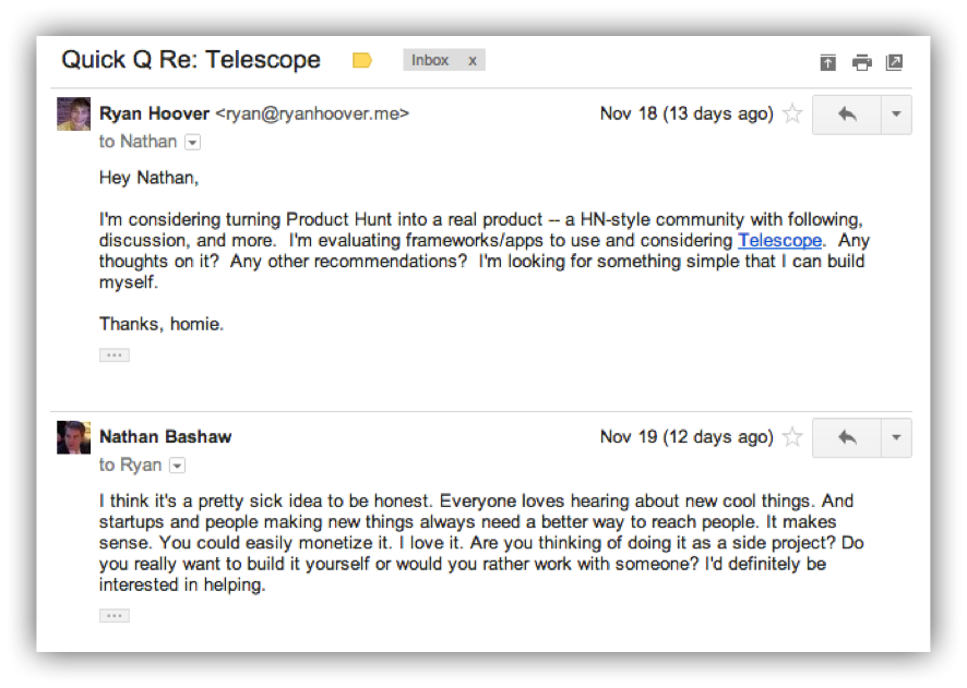 That was the first thing to do after launching the email list. Teaming up with his friend Nathan they built the Product Hunt website on top of an open-source framework for a Reddit/HN like community and published the website in just 8 days.