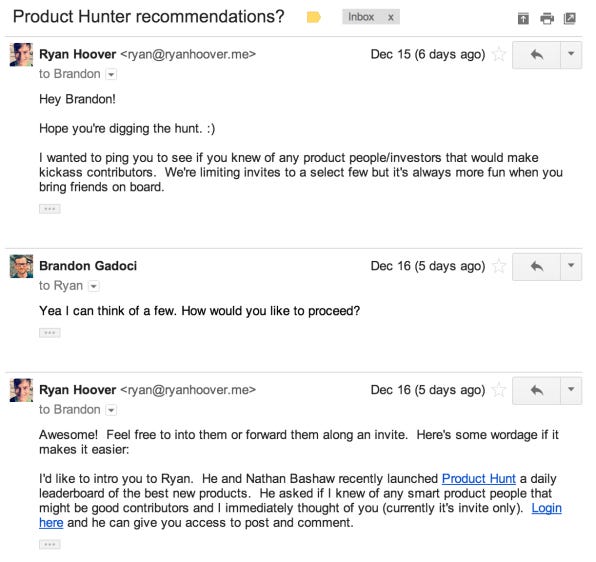 For the next growth cycle, it was all about identifying influential people who signed up, giving them access to contribute, and asking them to refer other people to Product Hunt. It was a lot of manual emails, but it definitely paid off.