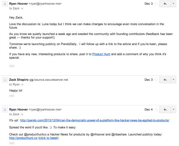 After getting Pando Daily to publish the first story about Product Hunt, Ryan again reached out to early contributors and asked them to share the story on their social media. He got to the first 400 users that way