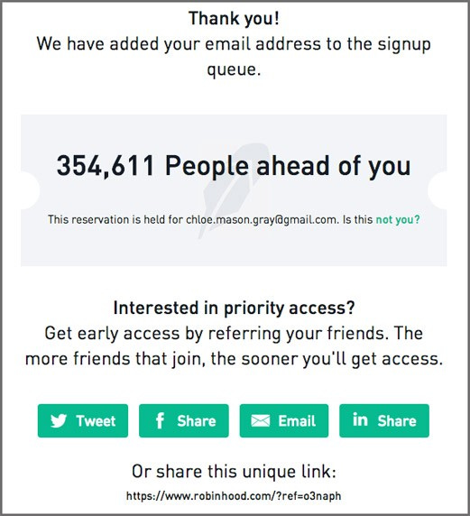 Conveniently located under their waiting list placement? A reward-based invitation to share Robinhoodâs exclusive offer with others in just one click. The more a person shared, the higher waiting-list position. The higher the position, the sooner one would gain access to Robinhood. And who doesnât want to jump ahead in the queue?