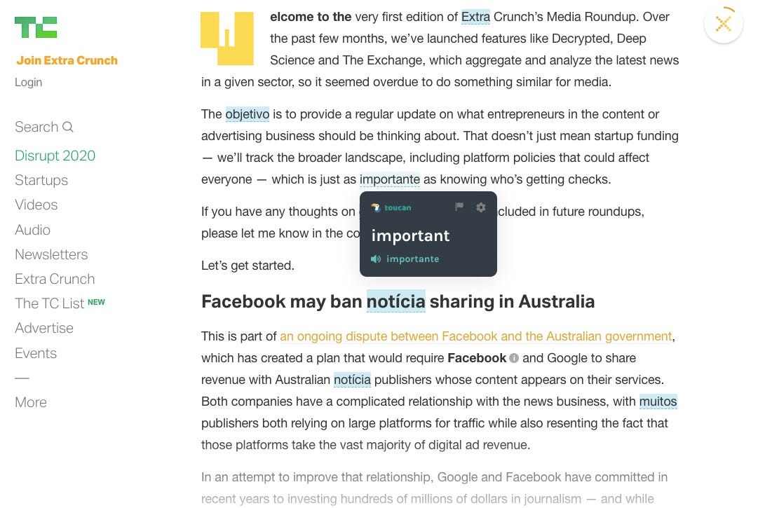 Toucan is a chrome extension that translates and highlights some words on your page. Instead of asking users to download an app, set aside a regular time to learn a new language through a one-size-fits-all curriculum, they immerse you in the language while youāre browsing the web and you pick it up from there.
