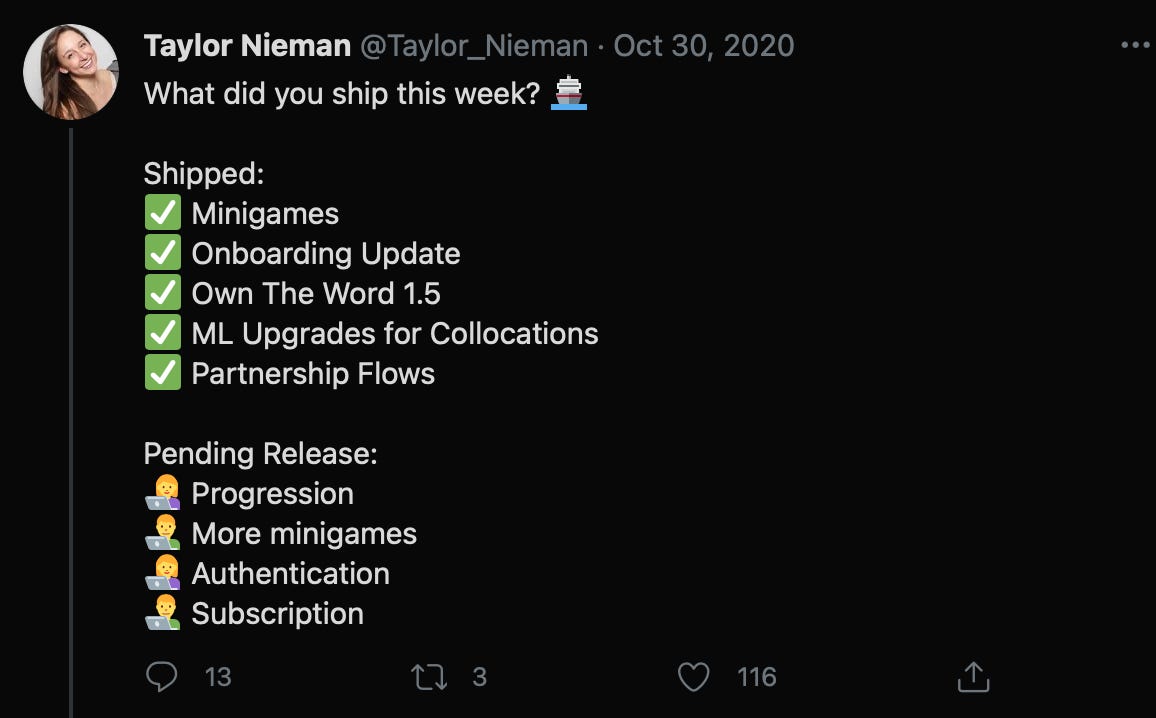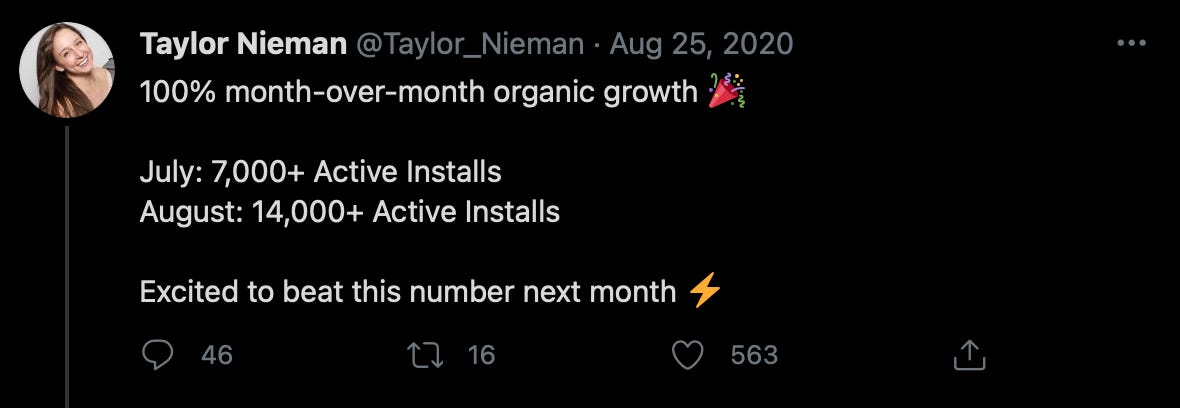 The other magical place on the internet is Twitter. It is one of the few avenues left where you can actually get decent organic distribution. Taylor went all in Twitter. In just under two years she took her account from 0 to over 10k followers.