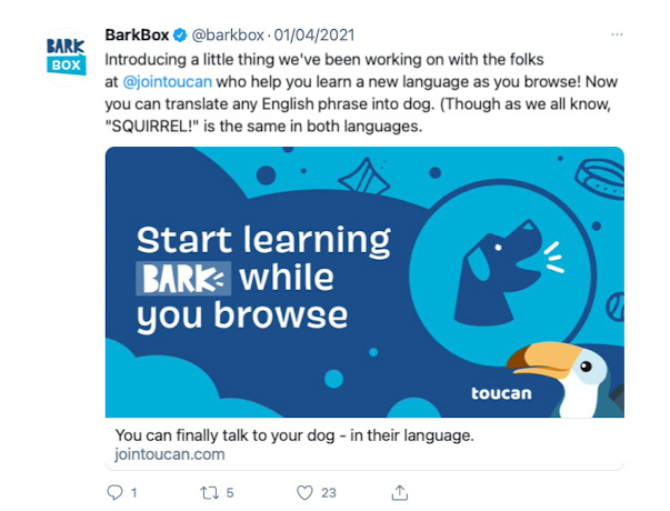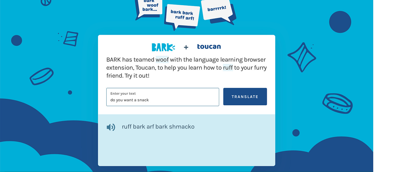 As an Aprilās fool joke, Barkbox got together with Toucan to Launch a dog translator version of Toucan. Simple put, users type in a sentence and the product translates it to woofs and raffs. If there is anything that I learned from my 25 year career on this earth is that dog owners love their dogs! And what better way to reach Hardcore Dog fans than to build a joke product for one of the biggest players in the pet space š¶.