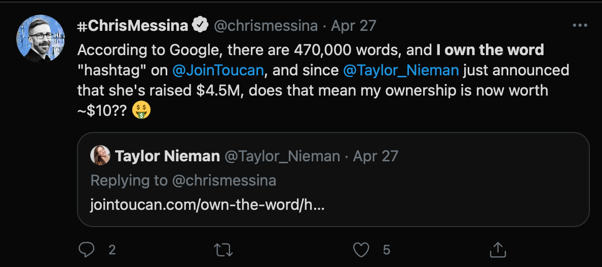 With Own The Word...Toucan got people to pay them $4/month for owning a word on their platform....on top of that, it got them to share those purchases far and wide (as it was in the users best interest after all)...generating more demand for these words...translating to more people buying words and all while organically spreading the word (pun intended š) about Toucan (the company).
