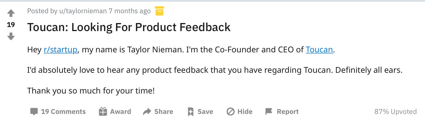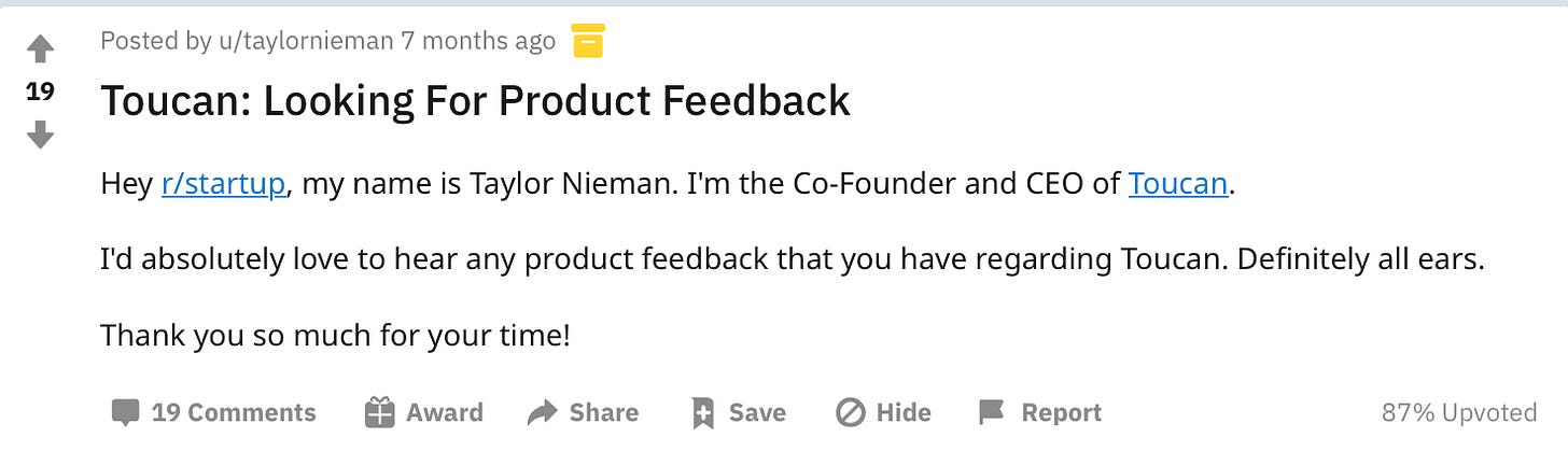 To validate the idea, Taylor and the team went down to coffee shops in LA (before you get 𤬠with meā¦this was pre-pandemic) and asked random strangers to download Toucan on their browser, play around with it and give some feedback. The team proactively segmented out anyone they know from giving feedback because: