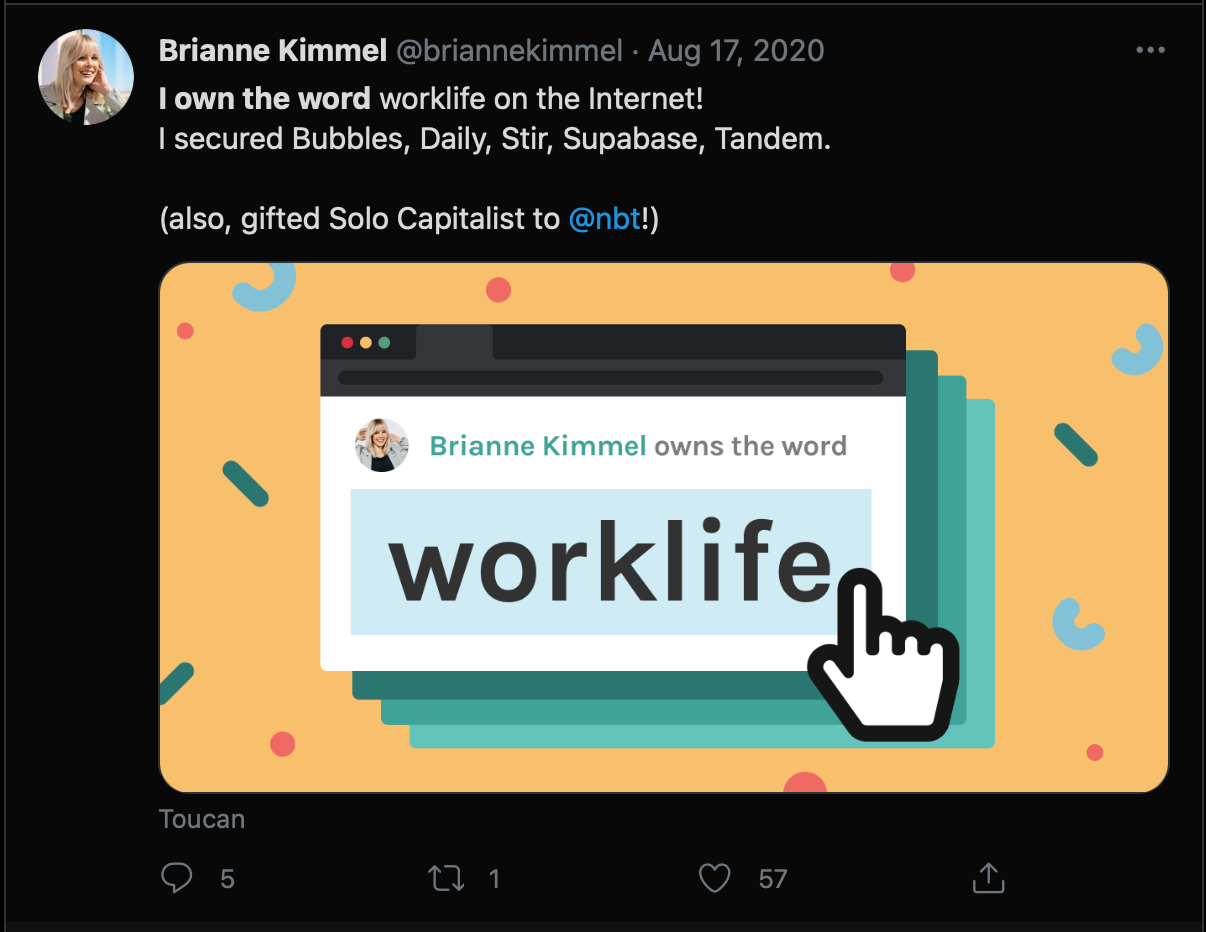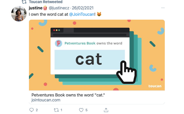 This is a fun one š¤ . There are only few things in life you canāt actually possess, a word in the dictionary is definitely one of those. Toucan on other hand, surfaces millions of words and their definition to customers every single month. What they created was a way for you (or your brand) to have a direct association with this one word that you are all about.