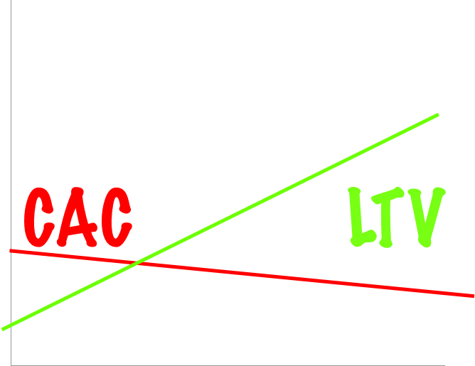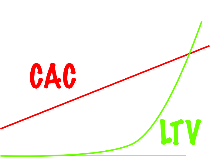 If your business is one that exhibits network effects, this means your value/customer or "LTV" can grow exponentially with users(you spend more time on Facebook because of all the friends you have there, so they can serve you a lot more ads than if you only had a handful of friends)
