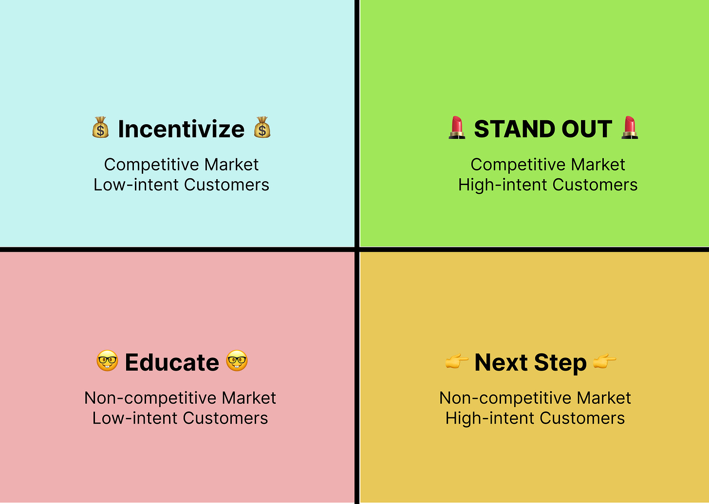 Guide users to the next step in the funnel to reach their “aha” moment. This works for high-intent customers in a low-competitive market.